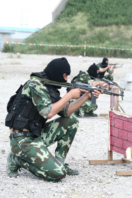 Armed police officers take part in an anti-terror exerciese in Shanghai on August 24, 2007. The drill is part of the preparations for the upcoming Special Olympics. [Xinhua]
