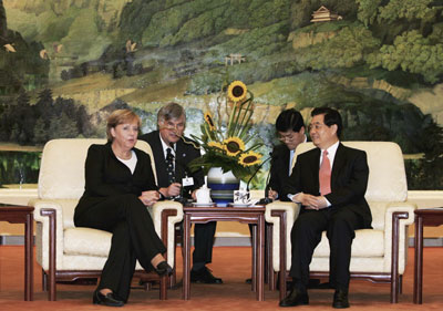 Updated: 2007-08-27 23:00 Chinese President Hu Jintao met with visiting German Chancellor Angela Merkel on Monday, calling for closer ties and broader cooperation in various fields.