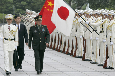 China's Defense Minister Cao Gangchuan (C), accompanied by newly appointed Japanese Defence Minister Masahiko Komura (2nd L),  reviews the honour guard at the Defence Ministry in Tokyo August 30, 2007. [Reuters]