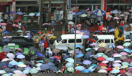 Parents wait for their children in rain outside a primary school in Lianyungang, East China's Jiangsu Province August 31, 2007. [newsphoto]