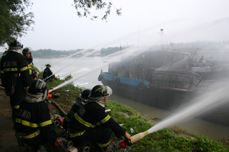 | Firefighters hose down the methanol-loaded vessels which caught fire at the Chenjiadun pier on the Hanjiang River in Wuhan, Central China's Hubei Province on September 2, 2007. One sailor was injured. The cause of the fire is under investigation. [Xinhua] |