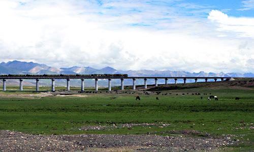 A train travels along the Qinghai-Tibet Railway in Southwest China's Tibet Autonomous Region, August 23, 2007. [chinadaily.com.cn]