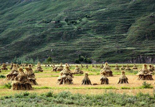 Bushels of Tibetan barley are stacked in piles near Jiangzi, Southwest China's Tibet Autonomous Region, August 24, 2007. [chinadaily.com.cn]