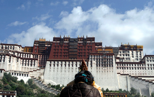 A Tibetan woman prays in front of the Potala Palace in Lhasa, Southwest China's Tibet Autonomous Region, August 22, 2007. [chinadaily.com.cn]