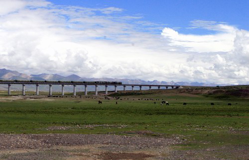 A train travels along the Qinghai-Tibet Railway in Southwest China's Tibet Autonomous Region, August 23, 2007. [chinadaily.com.cn]