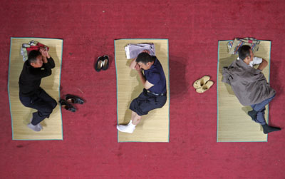 Poor parents of freshmen at Central China Normal University in Wuhan, Hubei Province sleep on the floor surface of the school's gymnasium on September 3, 2007. The school also provided sleeping mats, coverlets, bath facilities and hot tea. [newsphoto]