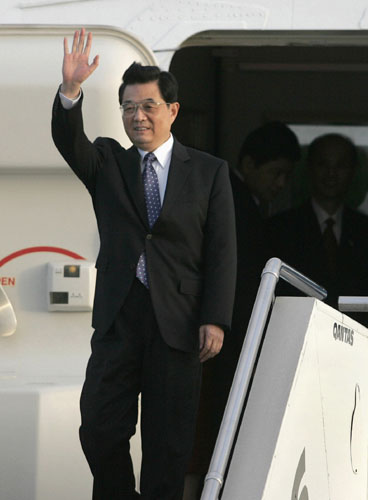 Chinese President Hu Jintao waves to the crowd as he arrives at Sydney airport September 5, 2007 ahead of the Asia-Pacific Economic Cooperation (APEC) Forum. [Reuters]
