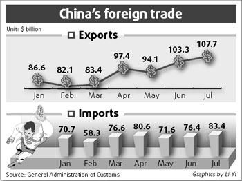 Updated: 2007-09-06 06:34 Doubts are being raised as to whether the government can achieve its target of reducing the trade surplus this year, with the figure soaring unexpectedly high in the first half. The trade surplus totaled $112.5 billion in the first six months this year, up almost 84 percent, or $51.1 billion, from the same period of 2006. Experts had said the impact of government measures would be seen from July. Most said the trade surplus would remain high this year but growth would slow. And July's figures prove them right. The surplus for the month, although still high at $24.35 billion, dropped from the record figure in June. From January to June, the government took a number of measures to tighten exports - particularly in resource-intensive and low value-added products - and encourage imports. It lowered the tax rebate on exports of low value-added products, requiring exporters to deposit margins for some processed goods, and imposed export taxes.