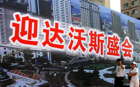 Updated: 2007-09-06 09:37 ![]() Pedestrians walk past a billboard promoting the World Economic Forum which opens in the northeastern Chinese city of Dalian on September 6, 2007, in Dalian, Liaoning Province. [Xinhua]