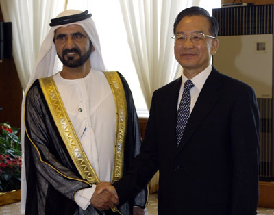 | Premier Wen Jiabao (R) shakes hands with Vice-President and Prime Minister of the United Arab Emirates (UAE) Sheikh Mohammed Bin Rashid Al Maktoum before their bilateral talks as part of the World Economic Forum in the city of Dalian September 6, 2007. The forum, also called the Inaugural Annual Meeting of the New Champions, runs from September 6 to 9 and involves over 1700 participants from more than 90 countries. [Reuters] |