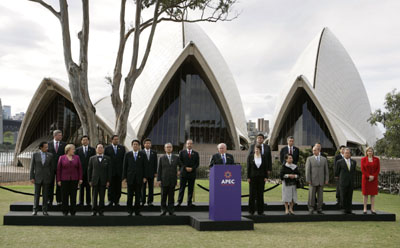APEC leaders and representatives pose for a family photo on the final day of the Asia-Pacific Economic Cooperation (APEC) leaders meeting at the Sydney Opera House September 9, 2007. [Reuters]