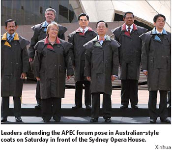 Updated: 2007-09-10 06:50 SYDNEY: The two-day gathering of the Asia-Pacific Economic Cooperation (APEC) forum closed yesterday with leaders from the 21 member economies focusing on global trade talks, climate change and building a sustainable future. The leaders issued two separate statements, one an appeal for trading nations to push forward stalled multilateral trade talks and the other a call for action to tackle climate change. Addressing the second session of the APEC meeting yesterday, President Hu Jintao said: "A fair, open, equitable and non-discriminatory multilateral trading regime is of vital importance to all countries, developing countries in particular, to invigorate their economies."