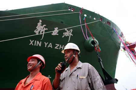 Super gigantic container vessel "Xin Ya Zhou," meaning "New Asia," is delivered to the owner in Shanghai, East China, Sept. 8, 2007. [Xinhua]