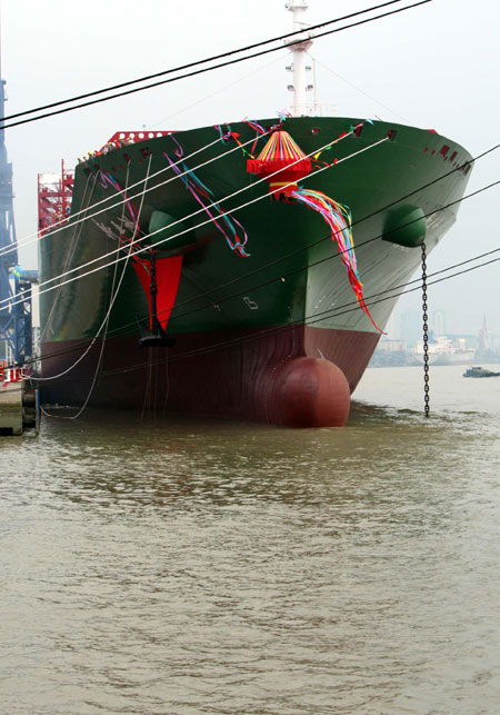 Super gigantic container vessel "Xin Ya Zhou," meaning "New Asia," is delivered to the owner in Shanghai, East China, Sept. 8, 2007.