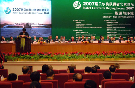 Photo taken on Sept 11, 2007 shows the opening ceremory of Nobel Laureates Beijing Forum at the Great Hall of the People in Beijing. [Xinhua]