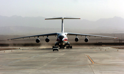 A Russian cargo-transport plane touches down at the Hotan Airport in Northwest China's Xinjiang Uygur Autonomous Region on September 11, 2007. [Xinhua]