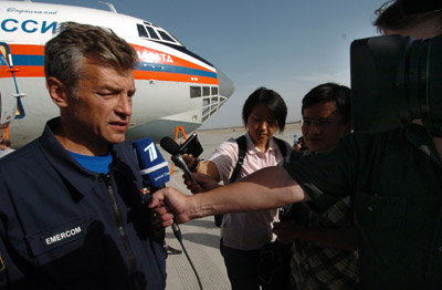 A Russian rescue worker talks to reporters upon arrival at the Hotan Airport in Northwest China's Xinjiang Uygur Autonomous Region on September 11, 2007. [Xinhua]