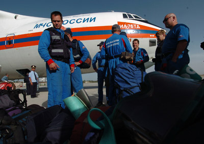 Russian rescue workers collect their luggages upon arrival at the Hotan Airport in Northwest China's Xinjiang Uygur Autonomous Region on September 11, 2007. [Xinhua]