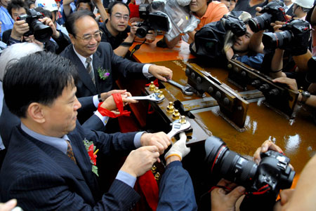Twenty guests screwed 20 golden bolts on to two steel beams, which were installed on the 101st floor of the Shanghai World Financial Center to mark the completion on Sept 14, 2007. [newsphoto]