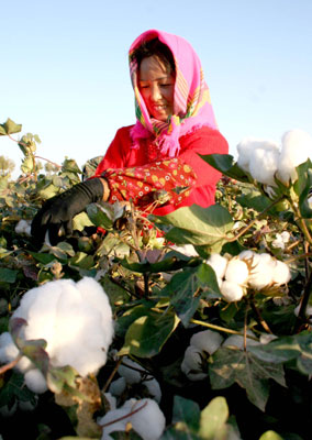 Farmers pick cotton at a cotton field in Hami, Northwest China's Xinjiang Uygur Autonomous Region September 14, 2007. [Newsphoto]