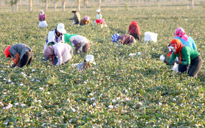 Farmers pick cotton at a cotton field in Hami, Northwest China's Xinjiang Uygur Autonomous Region September 14, 2007. [Newsphoto]
