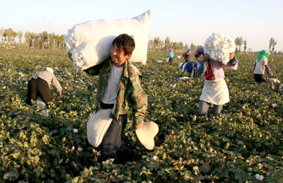 Farmers shoulder packs of cotton they picked at a cotton field in Hami, Northwest China's Xinjiang Uygur Autonomous Region September 14, 2007. [Newsphoto]