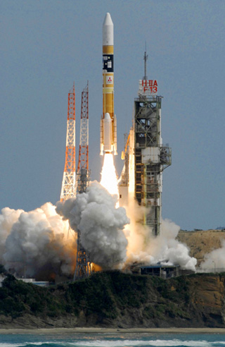 The rocket carrying the three-tonne SELENE orbiter is pictured blasting off from the island of Tanegashima, about 1,000 km south of Tokyo, September 14, 2007. Japan's space agency launched its much-delayed lunar probe Friday, beginning what it calls the largest mission to the moon since the US Apollo flights. [Reuters]