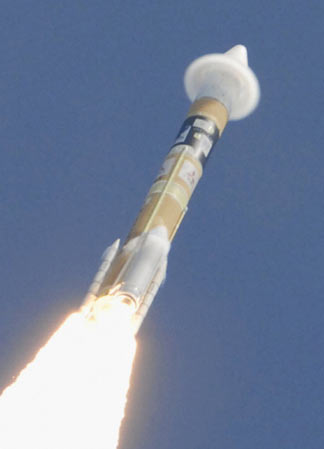The rocket carrying the three-tonne SELENE orbiter is pictured blasting off from the island of Tanegashima, about 1,000 km south of Tokyo, on September 14, 2007. [Reuters]