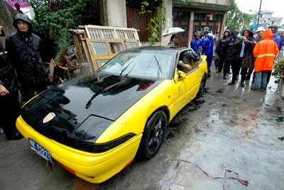 Updated: 2007-09-19 23:40 ![]() Rescue crews stand near a Ferrari limousine which was hoisted from a river in Wengyang, Yueqing, East China's Zhejiang Province September 19, 2007. Police rushed to the site after being tipped off that the limo plunged into the river. Five men were found dead and the cause of the accident is still under investigation. [newsphoto]