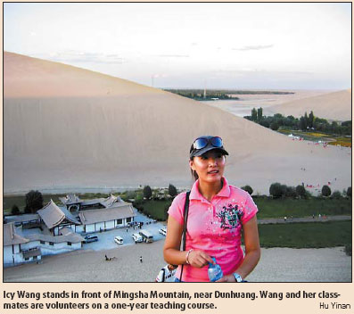 There is a saying that goes, "The most precious thing in the 21st century is talent." It was with a similar vision and confidence that Icy Wang and seven others came to Dunhuang, Gansu Province, on a one-year volunteer teaching course. The graduate students from Jilin University are a talented bunch. Wang is the eldest, a 24-year-old law student and deputy head of the student union. She is also an accomplished singer, clarinetist and keyboard player. They are determined to bring changes to the ancient city, a western frontier in the Han Dynasty (BC206-AD220). They are housed in sub-standard conditions. The six women stay in two overcrowded motel rooms, while the two lads bunk down in another room. But they don't mind too much. Ironically, perhaps, it is Dunhuang's economic development and booming tourism industry that is overwhelming them.