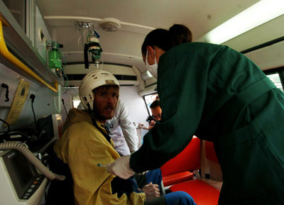 Updated: 2007-09-21 22:43 ![]() A missing Russian caoneist receives first aid in a helicopter after being found alive on the banks of the upper reaches of the Yurungkax River in Xinjiang Uygur Autonomous Region September 21, 2007. Alexander Zverev, 35, had been rushed to a hospital in Hotan for future treatment and doctors noted that he was suffering from dehydration and malnutrition following 25 days of missing outside. [Xinhua] |