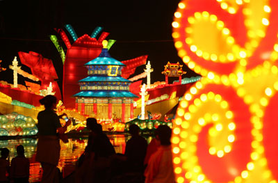 Tourists attend a lamp festival themed with the Beijing Olympic Games at a park in Beijing September 22, 2007. [Xinhua]