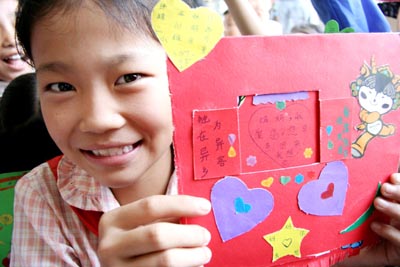 Zhang Mingyue, a left-behind pupil at No.2 Primary School in Hanshan County, East China's Anhui Province, holds up a card she made on September 21, 2007. The card will be mailed to her migrant-worker parents as a gift to celebrate Mid-Autumn Festival, which falls on September 25 this year. [newsphoto]