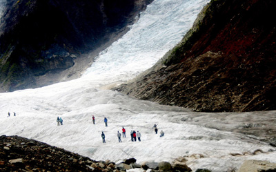 | Photo taken on September 19, 2007 shows a group of unidentified people walking on a glacier in Bomi County, Southwest China's Tibetan Autonomous Region. A group of 42 glaciers were found in the county with an average altitude of 4,200 meters above sea level in the southeast of the region. It could be the biggest glacier group on the Qinghai-Tibet plateau. [Xinhua] |