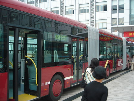People walk past a 25-meter-long bus called JNP6250G produced by Youngman Automobile Group, in front of its offices in Jinhua, East China's Zhejiang Province September 20, 2007. This bus is the longest of its kind in the world. [chinadaily.com.cn]