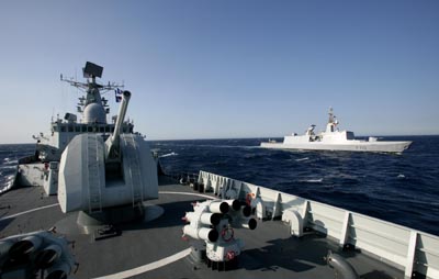 Chinese and French navies hold a farewell ceremony after the first joint naval exercise between China and France, code-named "China-France Friendship 2007", in the Mediterranean Sea on September 25, 2007. [Xinhua]
