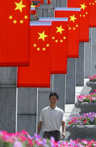 A local resident walks along the well-groomed Century Avenue in Shanghai on September 26, 2007. National flags have been put up on both sides of 1-kilometer street, to celebrate the upcoming National Day on October 1. [newsphoto]