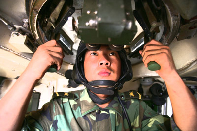 A "Red Army" soldier spies on the "enemy" during the Queshan 2007 exercise in Central China's Henan Province on Thursday, September 27, 2007. The seven-day exercise, launched on Saturday, is divided into four stages -- change of combat readiness, long-distance maneuvers, strategy planning, and combat. [Xinhua]
