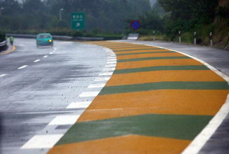 Photo taken on Sept 27, 2007 shows the first colorful highway in Central China's Henan Province. Parts of Zhengzhou-Luoyang Highway have been topped with a colorful layer of high tech materials as attention grabber and decelerator. The highway opened to traffic on Sept 29. [sina.com.cn]