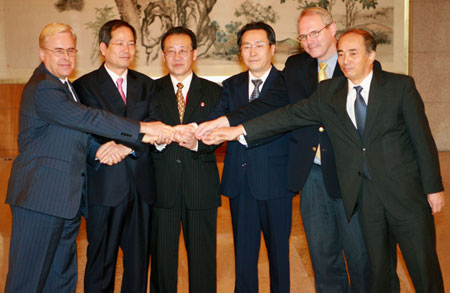Chief delegates to the Six-Party Talks pose for a group picture on September 30. From left: Alexander Losyukov from Russia, Chun Yung-woo from the ROK, Kim Kye-gwan from the DPRK, Wu Dawei from China, Christopher Hill from the United States and Kenichiro Sasae from Japan. [Xinhua]