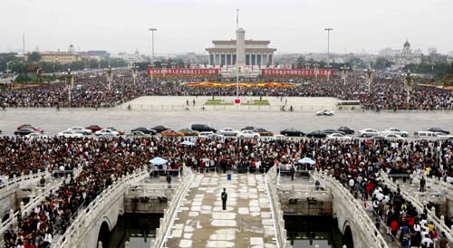 Tourists crowd into the Tiananmen Square in Beijing on National Day, October 1, 2007. China celebrates the 58th anniversary of the founding of the People's Republic of China on Monday. [Agencies] |