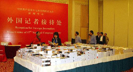 A worker arranges documents and materials for foreign journalists at the media center for the upcoming 17th Party Congress in Beijing on October 6, 2007. [xinhua]