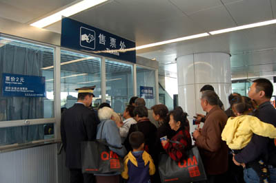 | Passengers line up to buy tickets for a ride on the brand-new subway line -Line 5 at East Datun Road Station in Chaoyang District, Beijing on Sunday, October 7, 2007. After four years and nine months of construction, Line 5, a north-south trunk subway, started operation at 2 pm Sunday. [newsphoto] |