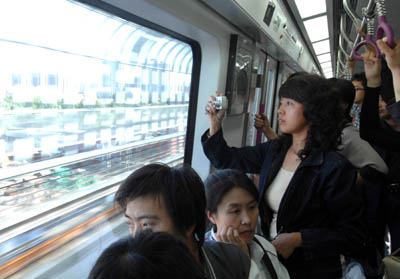| A passenger takes a photo of the scenery outside the new subway line - Line 5 in Beijing on Sunday, October 7, 2007. After four years and nine months of construction, Line 5, a north-south trunk subway, started operation at 2 pm Sunday. [Xinhua] |