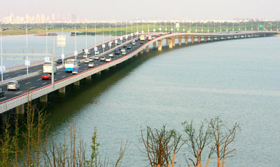Updated: 2007-10-10 23:20 ![]() Vehicles drive along a 7.37 km-long tunnel-bridge in Suzhou, East China's Jiangsu Province October 10, 2007, the day when the tunnel was put into operation after more than one year of construction. The project of the tunnel-bridge cost 2.71 billion yuan ($360.79 million). [newsphoto]