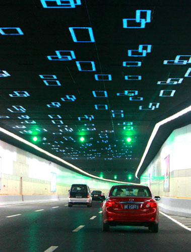 Vehicles move along a 3.46 km-long tunnel under the Dushuhu Lake in Suzhou, East China's Jiangsu Province on October 10, 2007. The tunnel is part of the 7.37 km-long Dushuhu bridge and tunnel project, which opened to traffic Wednesday after more than one year of construction. [newsphoto]