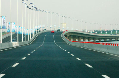 Vehicles move along a bridge in Suzhou, East China's Jiangsu Province on October 10, 2007. The bridge is part of the 7.37 km-long Dushuhu bridge and tunnel project, which opened to traffic Wednesday after more than one year of construction. The project cost 2.71 billion yuan ($360.79 million). [newsphoto]