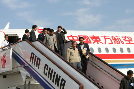 Delegates from West China's Gansu Province descend the stairs of an airplane at Beijing Capital International Airport October 12, 2007. A total of 2,217 delegates have been elected to attend the upcoming 17th National Congress of the Communist Party of China, which will begin on October 15. [Xinhua]