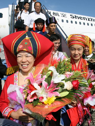Delegates from South China's Guangxi Zhuang Autonomous Region hold bouquets after disembarking at Beijing Capital International Airport October 12, 2007. A total of 2,217 delegates have been elected to attend the upcoming 17th National Congress of the Communist Party of China, which will begin on October 15. [Xinhua]