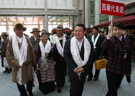 Delegates from the Tibet Autonomous Region arrive at Beijing Capital International Airport October 12, 2007. A total of 2,217 delegates have been elected to attend the upcoming 17th National Congress of the Communist Party of China, which begins on October 15. [Xinhua]